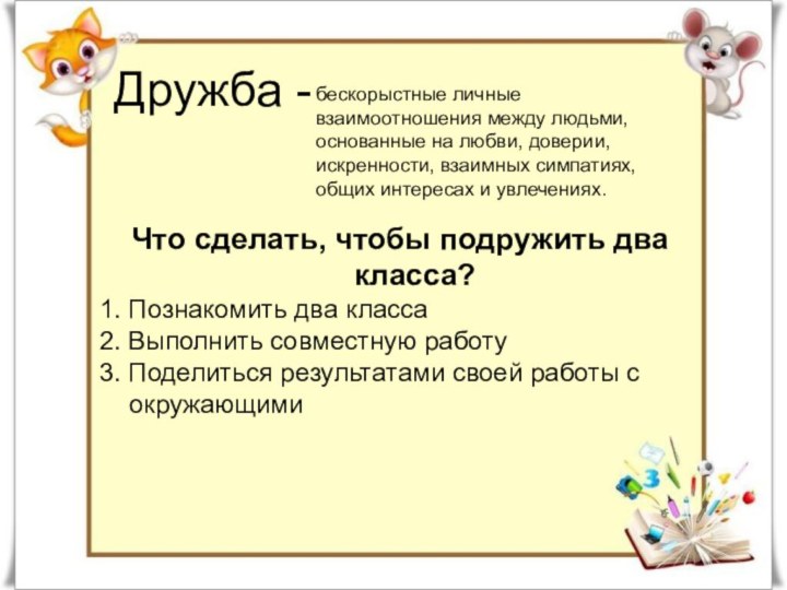 правила дружбы;- донести до учащихся значение слова «дружба».
