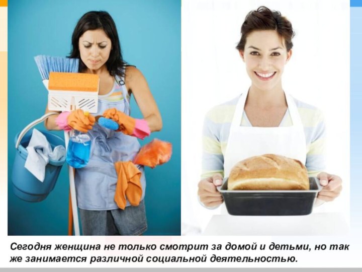 Сегодня женщина не только смотрит за домой и детьми, но так же занимается различной социальной деятельностью.
