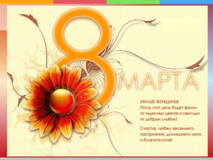 Международный Женский День8 МАРТА Трудно представить нашу жизнь без этих очаровательных, милых, нежных созданий – женщин! Во многих странах  8 марта женщин поздравляют с праздником - Международным Женским Днем. У каждого человека есть мама, бабушка, которых нужно обязательно поздравить в этот замечательный весенний праздник! В начале прошлого века женщины-крестьянки занимались надомной работой – вышивали, стирали, готовили Или занимались тяжелой работой на улице - косили траву, смотрели за огородом, ухаживали за домашним скотом. Потом женщины захотели улучшить свои условия жизни и труда и стали выходить Со временем женщины отстояли свои права, сократилось количество рабочих часов и их Сегодня женщина не только смотрит за домой и детьми, но так же занимается различной социальной деятельностью. Женщины занимаются спортом Женщины танцуют, играют в балете. Женщина водит машину Женщины преуспевают в бизнесе Женщины занимаются наукой Женщины покоряют космос Но, не смотря на такую активную деятельность наравне с мужчинами, женщина была Мужчины должны заботится о женщинах А детки пусть радуют маму своим хорошим поведением и отличными оценками! Давайте, поздравим 8 Марта всех женщин с этим замечательным весенним праздником! Дорогие, милые женщины!В этот праздничный день хочу пожелать вам семейного благополучия, жизненной
