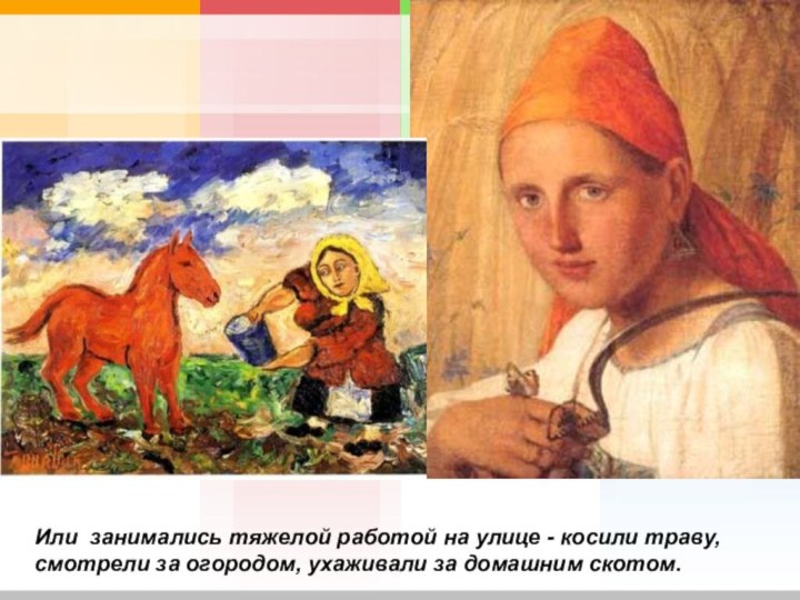 Или занимались тяжелой работой на улице - косили траву, смотрели за огородом, ухаживали за домашним скотом.