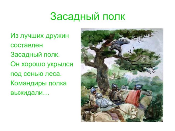Засадный полкИз лучших дружинсоставлен Засадный полк. Он хорошо укрылся под сенью леса. Командиры полкавыжидали…