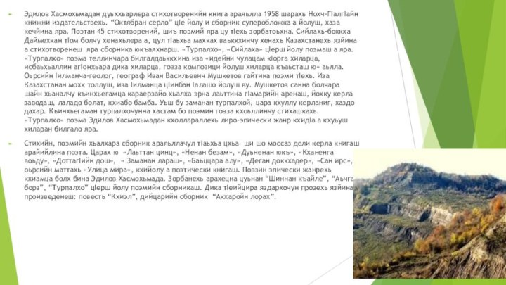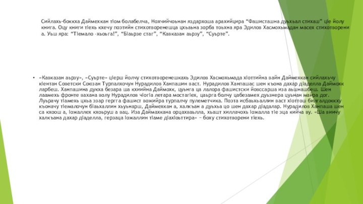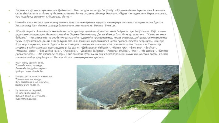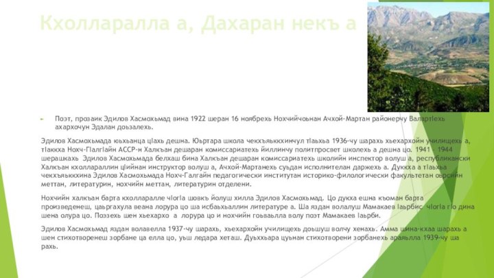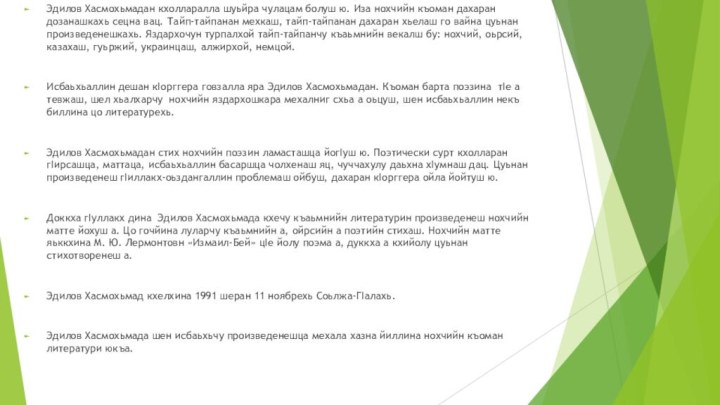 Эдилов Хасмохьмад яздан волавелла 1937-чу шарахь, хьехархойн училищехь доьшуш волчу хенахь. Амма шина-кхаа шарахь а шен стихотворенеш зорбане ца елла цо, уьш ледара хеташ. Дуьххьара цуьнан стихотворени зорбанехь араяьлла 1939-чу шарахь.