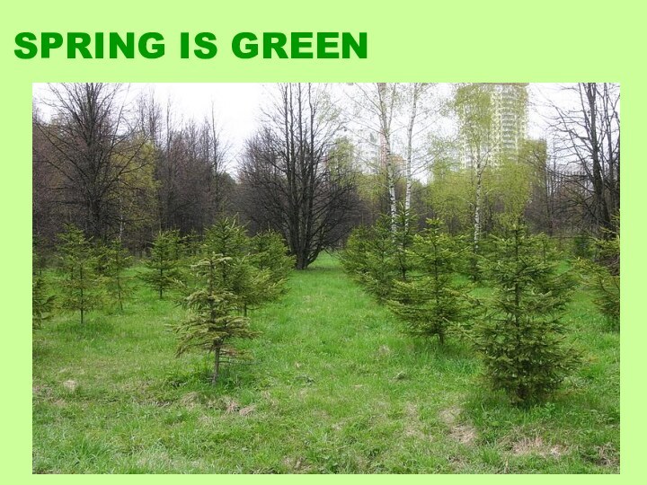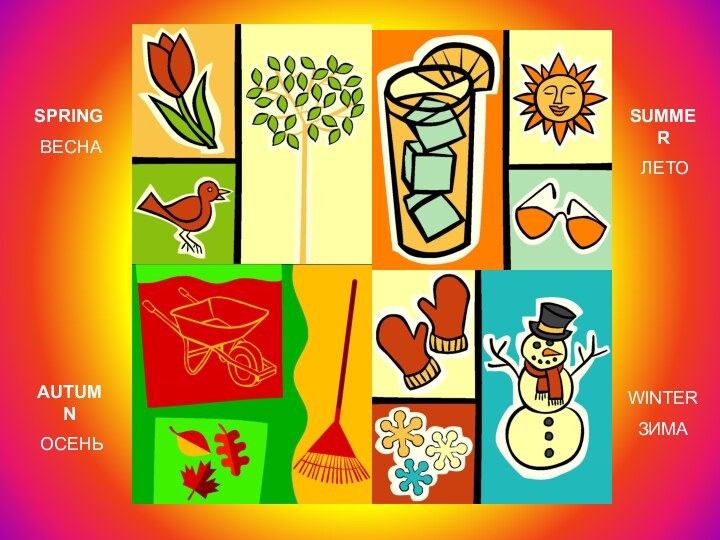 SEASONS SPRING ВЕСНАSUMMER ЛЕТОAUTUMN ОСЕНЬWINTER ЗИМА SPRING IS GREEN SUMMER IS BRIGHT AUTUMN IS YELLOW WINTER IS WHITE SPRING IS GREEN SUMMER IS BRIGHT AUTUMN IS YELLOW WINTER IS WHITE Весной все зеленое Летом все яркое Осенью все желтое Зимой все белое Spring is green Summer is bright Autumn is yellow Winter is white