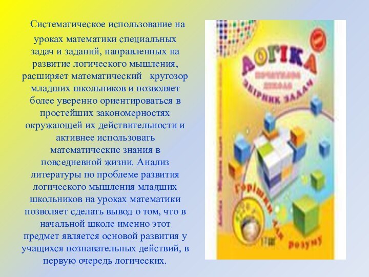 кругозор младших школьников и позволяет более уверенно ориентироваться в простейших закономерностях окружающей их действительности и активнее использовать математические знания в повседневной жизни. Анализ литературы по проблеме развития логического мышления младших школьников на уроках математики позволяет сделать вывод о том, что в начальной школе именно этот предмет является основой развития у учащихся познавательных действий, в первую очередь логических.