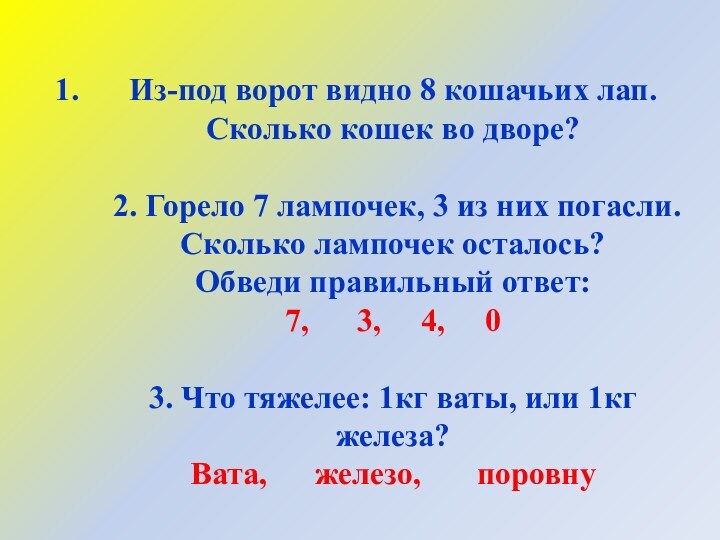3. Что тяжелее: 1кг ваты, или 1кг железа?