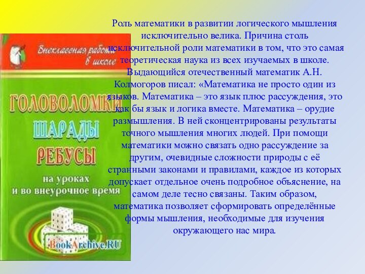 самая теоретическая наука из всех изучаемых в школе. Выдающийся отечественный математик А.Н. Колмогоров писал: «Математика не просто один из языков. Математика – это язык плюс рассуждения, это как бы язык и логика вместе. Математика – орудие размышления. В ней сконцентрированы результаты точного мышления многих людей. При помощи математики можно связать одно рассуждение за другим, очевидные сложности природы с её странными законами и правилами, каждое из которых допускает отдельное очень подробное объяснение, на самом деле тесно связаны. Таким образом, математика позволяет сформировать определённые формы мышления, необходимые для изучения окружающего нас мира.