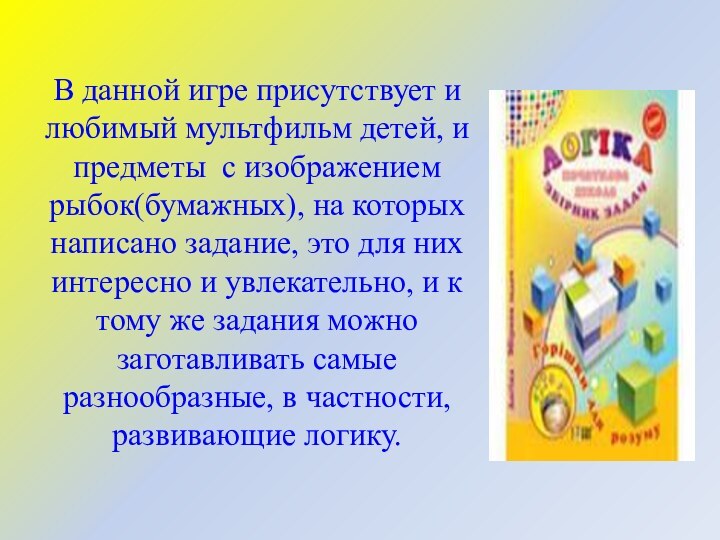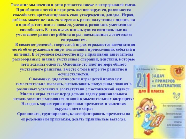 способность аргументировать свои утверждения, доводы. Играя, ребёнок может не только закрепить ранее полученные знания, но и приобретать новые навыки, умения, развивать умственные способности. В этих целях используются специальные на умственное развитие ребёнка игры, насыщенные логическим содержанием.