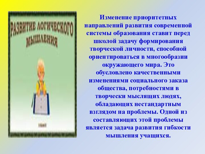 многообразии окружающего мира. Это обусловлено качественными изменениями социального заказа общества, потребностями в творчески мыслящих людях, обладающих нестандартным взглядом на проблемы. Одной из составляющих этой проблемы является задача развития гибкости мышления учащихся.