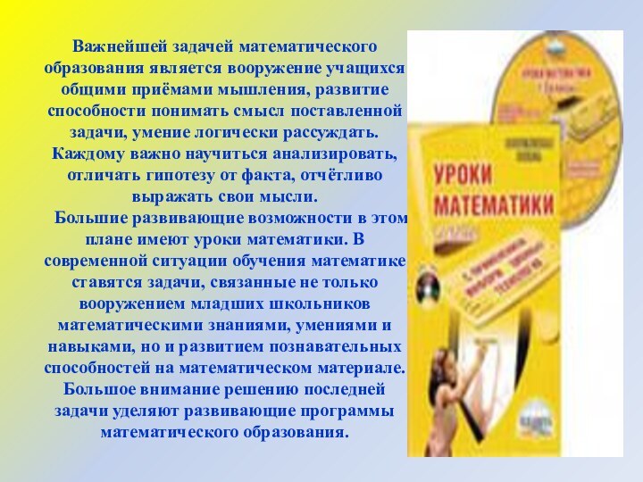 Большие развивающие возможности в этом плане имеют уроки математики. В современной ситуации обучения математике ставятся задачи, связанные не только вооружением младших школьников математическими знаниями, умениями и навыками, но и развитием познавательных способностей на математическом материале. Большое внимание решению последней задачи уделяют развивающие программы математического образования.
