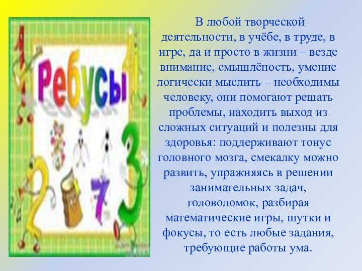 везде внимание, смышлёность, умение логически мыслить – необходимы человеку, они помогают решать проблемы, находить выход из сложных ситуаций и полезны для здоровья: поддерживают тонус головного мозга, смекалку можно развить, упражняясь в решении занимательных задач, головоломок, разбирая математические игры, шутки и фокусы, то есть любые задания, требующие работы ума.