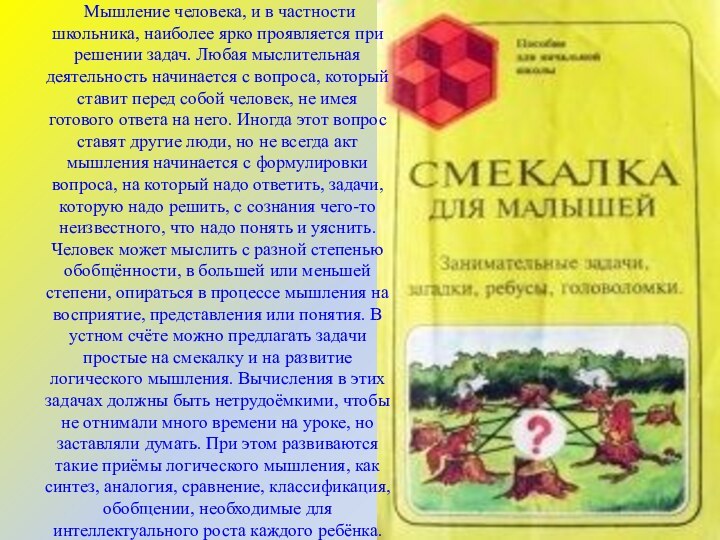 с вопроса, который ставит перед собой человек, не имея готового ответа на него. Иногда этот вопрос ставят другие люди, но не всегда акт мышления начинается с формулировки вопроса, на который надо ответить, задачи, которую надо решить, с сознания чего-то неизвестного, что надо понять и уяснить. Человек может мыслить с разной степенью обобщённости, в большей или меньшей степени, опираться в процессе мышления на восприятие, представления или понятия. В устном счёте можно предлагать задачи простые на смекалку и на развитие логического мышления. Вычисления в этих задачах должны быть нетрудоёмкими, чтобы не отнимали много времени на уроке, но заставляли думать. При этом развиваются такие приёмы логического мышления, как синтез, аналогия, сравнение, классификация, обобщении, необходимые для интеллектуального роста каждого ребёнка.