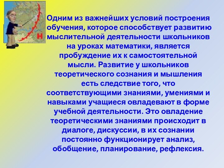 их к самостоятельной мысли. Развитие у школьников теоретического сознания и мышления есть следствие того, что соответствующими знаниями, умениями и навыками учащиеся овладевают в форме учебной деятельности. Это овладение теоретическими знаниями происходит в диалоге, дискуссии, в их сознании постоянно функционирует анализ, обобщение, планирование, рефлексия.