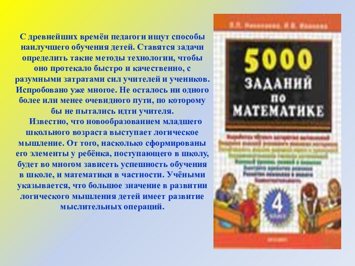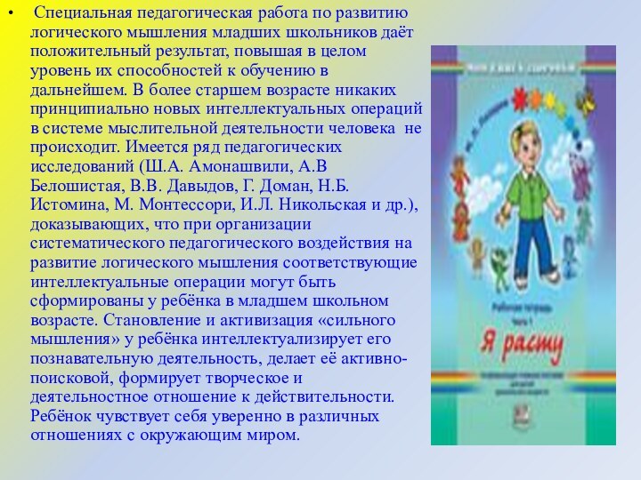 их способностей к обучению в дальнейшем. В более старшем возрасте никаких принципиально новых интеллектуальных операций в системе мыслительной деятельности человека не происходит. Имеется ряд педагогических исследований (Ш.А. Амонашвили, А.В Белошистая, В.В. Давыдов, Г. Доман, Н.Б. Истомина, М. Монтессори, И.Л. Никольская и др.), доказывающих, что при организации систематического педагогического воздействия на развитие логического мышления соответствующие интеллектуальные операции могут быть сформированы у ребёнка в младшем школьном возрасте. Становление и активизация «сильного мышления» у ребёнка интеллектуализирует его познавательную деятельность, делает её активно-поисковой, формирует творческое и деятельностное отношение к действительности. Ребёнок чувствует себя уверенно в различных отношениях с окружающим миром.