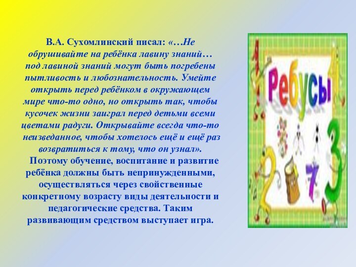 В.А. Сухомлинский писал: «…Не обрушивайте на ребёнка лавину