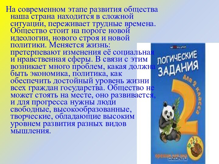 на пороге новой идеологии, нового строя и новой политики. Меняется жизнь: претерпевают изменения её социальная и нравственная сферы. В связи с этим возникает много проблем, какая должна быть экономика, политика, как обеспечить достойный уровень жизни всех граждан государства. Общество не может стоять на месте, оно развивается, и для прогресса нужны люди свободные, высокообразованные, творческие, обладающие высоким уровнем развития разных видов мышления.
