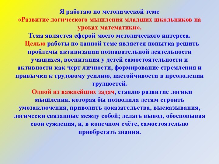 Одной из важнейших задач, ставлю развитие логики мышления, которая бы позволила детям строить умозаключения, приводить доказательства, высказывания, логически связанные между собой; делать вывод, обосновывая свои суждения, и, в конечном счёте, самостоятельно приобретать знания.