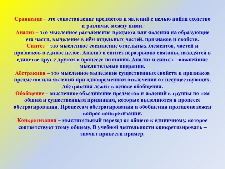 Обобщение – мысленное объединение предметов и явлений в группы по тем общим и существенным признакам, которые выделяются в процессе абстрагирования. Процессам абстрагирования и обобщения противоположен вопрос конкретизации.