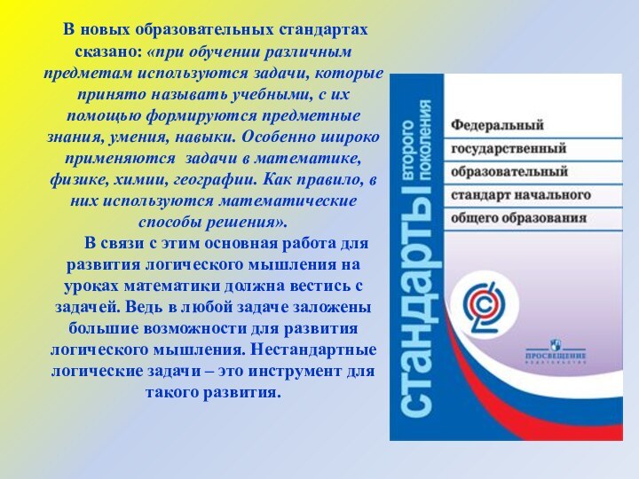 В связи с этим основная работа для развития логического мышления на уроках математики должна вестись с задачей. Ведь в любой задаче заложены большие возможности для развития логического мышления. Нестандартные логические задачи – это инструмент для такого развития.