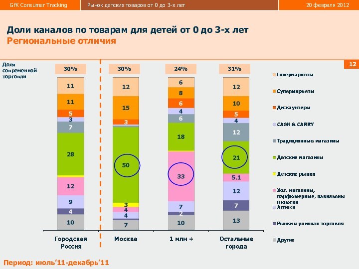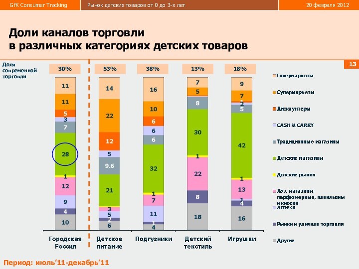 Доля современной торговли30%53%38%13%Доли каналов торговли в различных категориях детских товаров18%Период: июль’11-декабрь’11
