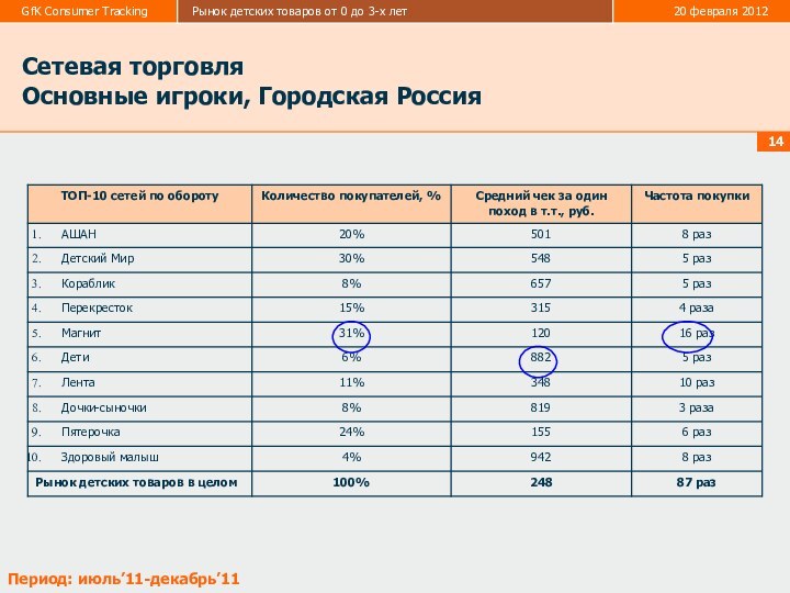 Сетевая торговля Основные игроки, Городская Россия Период: июль’11-декабрь’11