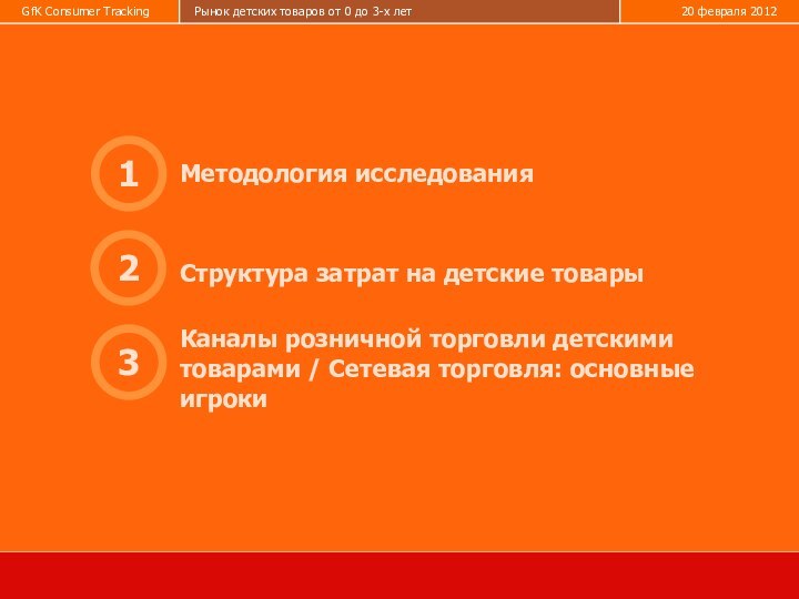 Методология исследования1Структура затрат на детские товары2Каналы розничной торговли детскими товарами / Сетевая торговля: основные игроки3