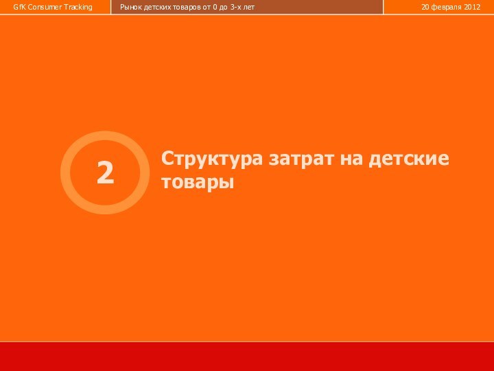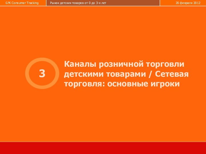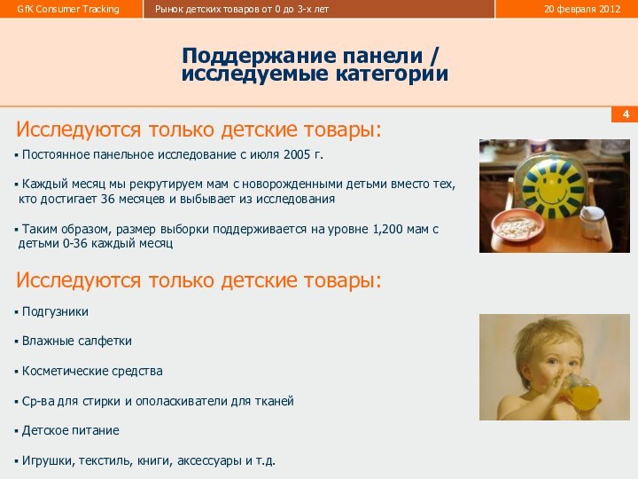 Рынок детских товаровот 0 до 3-х лет		Анастасия ДжафароваВедущий Консультантотдела потребительских панелей Методология исследования1Структура затрат на детские товары2Каналы розничной торговли детскими товарами / Сетевая торговля: основные игроки3 Размер и структура выборкиЦелевая Группа:мамы с детьми 0-36 месяцевРегиональное покрытие: городская Россия Поддержание панели / исследуемые категории Постоянное панельное исследование с июля 2005 г. Респонденты фиксируют все свои покупки по исследуемым категориямРегистрируется следующая информация: дата покупки Структура затрат на детские товары2 Средняя СтоимостьКорзины (руб./месяц) Городская Россия Корзина детских товаров (дети 0-3 года) Средняя СтоимостьКорзины (руб./месяц) 3,585Период: июль’11-декабрь’11 Городская Россия Корзина детских товаров Средняя СтоимостьКорзины (руб./месяц) 3,5854,888Городская Россия Корзина детских товаров	   Стоимостные доли Каналы розничной торговли детскими товарами / Сетевая торговля: основные игроки3 Доля форматов современной торговли товаров повседневного спроса (FMCG) Региональные отличияДоля современной торговли48%66%71%Период: Доли каналов по товарам для детей от 0 до 3-х лет Региональные Доля современной торговли30%53%38%13%Доли каналов торговли  в различных категориях детских товаров18%Период: июль’11-декабрь’11 Сетевая торговля Основные игроки, Городская Россия Период: июль’11-декабрь’11 Спасибо за внимание!