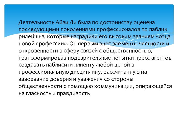 званием «отца новой профессии». Он первым внес элементы честности и откровенности в сферу связей с общественностью, трансформировав подозрительные попытки пресс-агентов создавать паблисити клиенту любой ценой в профессиональную дисциплину, рассчитанную на завоевание доверия и уважения со стороны общественности с помощью коммуникации, опирающейся на гласность и правдивость