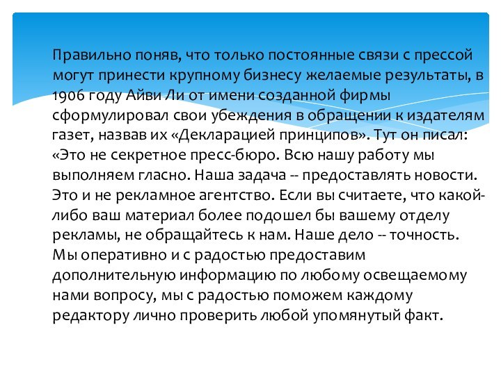 Айви Ли от имени созданной фирмы сформулировал свои убеждения в обращении к издателям газет, назвав их «Декларацией принципов». Тут он писал: «Это не секретное пресс-бюро. Всю нашу работу мы выполняем гласно. Наша задача -- предоставлять новости. Это и не рекламное агентство. Если вы считаете, что какой-либо ваш материал более подошел бы вашему отделу рекламы, не обращайтесь к нам. Наше дело -- точность. Мы оперативно и с радостью предоставим дополнительную информацию по любому освещаемому нами вопросу, мы с радостью поможем каждому редактору лично проверить любой упомянутый факт.