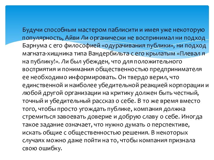 с его философией «одурачивания публики», ни подход магната-хищника типа Вандербильта с его крылатым «Плевал я на публику!». Ли был убежден, что для положительного восприятия и понимания общественностью предпринимателя ее необходимо информировать. Он твердо верил, что единственной и наиболее убедительной реакцией корпорации и любой другой организации на критику должен быть честный, точный и убедительный рассказ о себе. В то же время вместо того, чтобы просто угождать публике, компания должна стремиться завоевать доверие и добрую славу о себе. Иногда такое задание означает, что нужно думать о перспективе, искать общие с общественностью решения. В некоторых случаях можно даже пойти на то, чтобы компания признала свою ошибку.
