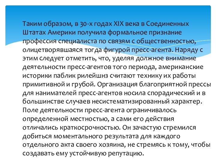 связям с общественностью, олицетворявшаяся тогда фигурой пресс-агента. Наряду с этим следует отметить, что, уделяя должное внимание деятельности пресс-агентов того периода, американские историки паблик рилейшнз считают технику их работы примитивной и грубой. Организация благоприятной прессы для нанимателей пресс-агентов носила спорадический и в большинстве случаев несистематизированный характер. Поле деятельности пресс-агента ограничивалось определенной местностью, а сами его действия отличались краткосрочностью. Он зачастую стремился добиться моментального результата для каждого отдельного акта своего хозяина, не стремясь к тому, чтобы создавать ему устойчивую репутацию.