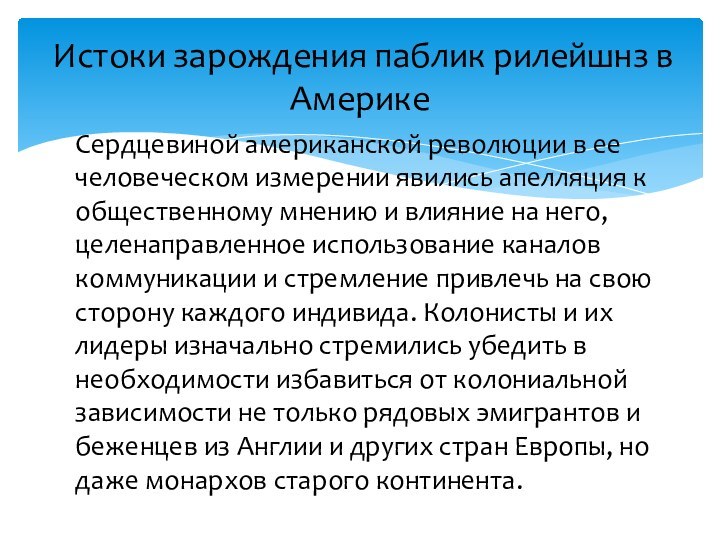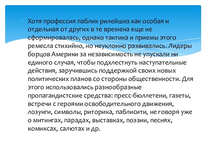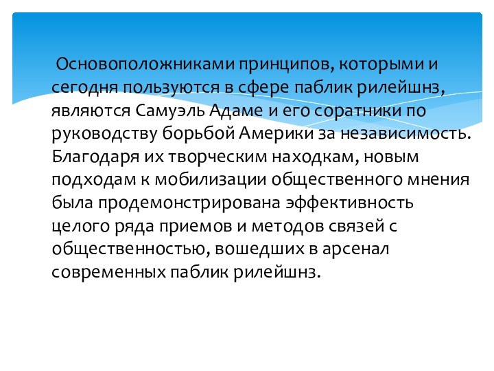 по руководству борьбой Америки за независимость. Благодаря их творческим находкам, новым подходам к мобилизации общественного мнения была продемонстрирована эффективность целого ряда приемов и методов связей с общественностью, вошедших в арсенал современных паблик рилейшнз.