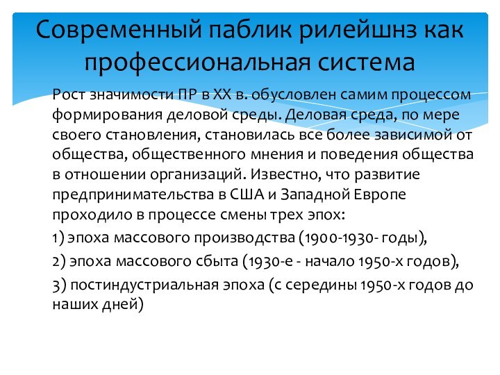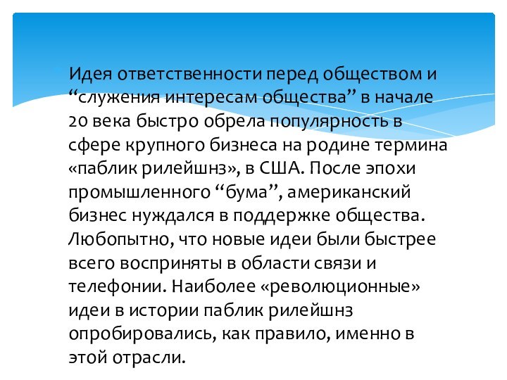 крупного бизнеса на родине термина «паблик рилейшнз», в США. После эпохи промышленного “бума”, американский бизнес нуждался в поддержке общества. Любопытно, что новые идеи были быстрее всего восприняты в области связи и телефонии. Наиболее «революционные» идеи в истории паблик рилейшнз опробировались, как правило, именно в этой отрасли.