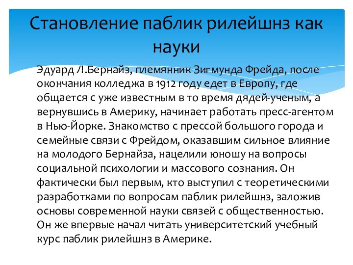 уже известным в то время дядей-ученым, а вернувшись в Америку, начинает работать пресс-агентом в Нью-Йорке. Знакомство с прессой большого города и семейные связи с Фрейдом, оказавшим сильное влияние на молодого Бернайза, нацелили юношу на вопросы социальной психологии и массового сознания. Он фактически был первым, кто выступил с теоретическими разработками по вопросам паблик рилейшнз, заложив основы современной науки связей с общественностью. Он же впервые начал читать университетский учебный курс паблик рилейшнз в Америке.