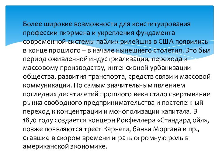 в XIX ст. С середины прошлого столетия паблик рилейшнз как общественный феномен, подготовленный условиями предыдущего этапа исторического развития демократических основ американского общества, достигают определенности, приобретая относительную самостоятельность и свойственные им специфические черты.