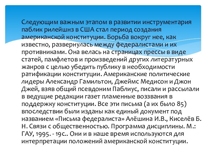 нее, как известно, развернулась между федералистами и их противниками. Она велась на страницах прессы в виде статей, памфлетов и произведений других литературных жанров с целью убедить публику в необходимости ратификации конституции. Американские политические лидеры Александр Гамильтон, Джеймс Медисон и Джон Джей, взяв общий псевдоним Паблиус, писали и рассылали в ведущие редакции газет пламенные воззвания в поддержку конституции. Все эти письма (а их было 85) впоследствии были изданы как единый документ под названием «Письма федералиста» Алёшина И.В., Киселёв Б.Н. Связи с общественностью. Программа дисциплины. М.: ГАУ, 1995. - 19с.. Они и в наше время используются для интерпретации положений американской конституции.