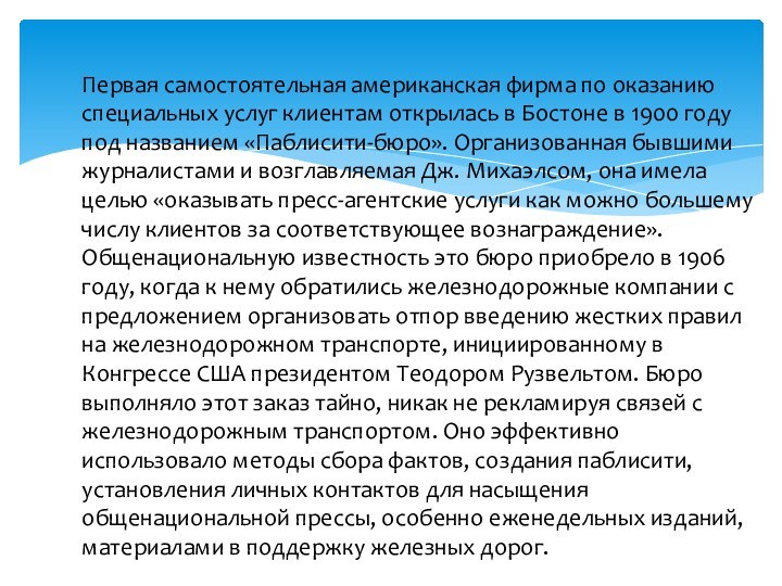 «Паблисити-бюро». Организованная бывшими журналистами и возглавляемая Дж. Михаэлсом, она имела целью «оказывать пресс-агентские услуги как можно большему числу клиентов за соответствующее вознаграждение». Общенациональную известность это бюро приобрело в 1906 году, когда к нему обратились железнодорожные компании с предложением организовать отпор введению жестких правил на железнодорожном транспорте, инициированному в Конгрессе США президентом Теодором Рузвельтом. Бюро выполняло этот заказ тайно, никак не рекламируя связей с железнодорожным транспортом. Оно эффективно использовало методы сбора фактов, создания паблисити, установления личных контактов для насыщения общенациональной прессы, особенно еженедельных изданий, материалами в поддержку железных дорог.
