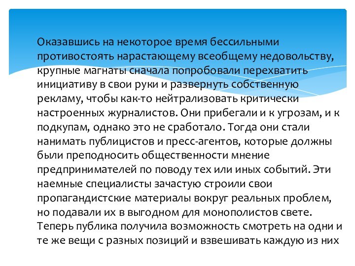 руки и развернуть собственную рекламу, чтобы как-то нейтрализовать критически настроенных журналистов. Они прибегали и к угрозам, и к подкупам, однако это не сработало. Тогда они стали нанимать публицистов и пресс-агентов, которые должны были преподносить общественности мнение предпринимателей по поводу тех или иных событий. Эти наемные специалисты зачастую строили свои пропагандистские материалы вокруг реальных проблем, но подавали их в выгодном для монополистов свете. Теперь публика получила возможность смотреть на одни и те же вещи с разных позиций и взвешивать каждую из них