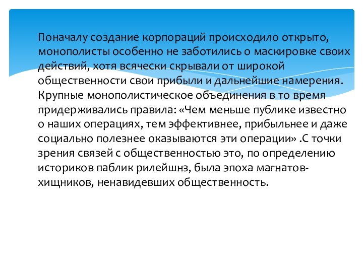 широкой общественности свои прибыли и дальнейшие намерения. Крупные монополистическое объединения в то время придерживались правила: «Чем меньше публике известно о наших операциях, тем эффективнее, прибыльнее и даже социально полезнее оказываются эти операции» .С точки зрения связей с общественностью это, по определению историков паблик рилейшнз, была эпоха магнатов-хищников, ненавидевших общественность.