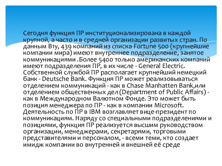 В1у, 439 компаний из списка Fortune 500 (крупнейшие компании мира) имеют внутреннее подразделение, занятое коммуникациями .Более 5400 только американских компаний имеют подразделения ПР, в их числе - General Electric. Собственной службой ПР располагает крупнейший немецкий банк - Deutsche Bank. Функция ПР может реализовываться отделением коммуникаций - как в Chase Manhatten Bank,или отделением общественных дел (Department of Public Affairs) - как в Международном Валютном Фонде. Это может быть позиция менеджера по ПР - как в компании Microsoft. Деятельность по ПР в IBM возглавляет вице-президент по коммуникациям. Наряду со специальными подразделениями и позициями, функция ПР реализуется высшим руководством организации, менеджерами, секретарями, торговыми представителями и персоналом, - всеми теми, кто создает имидж компании во внутренней и внешней её среде