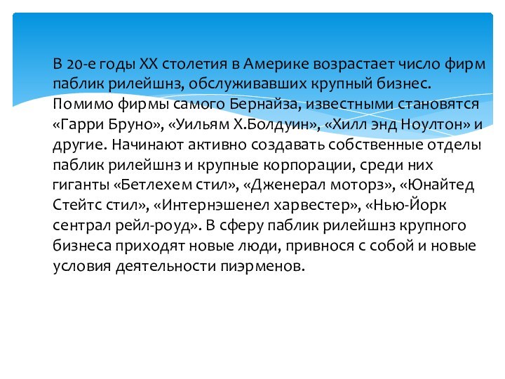 самого Бернайза, известными становятся «Гарри Бруно», «Уильям Х.Болдуин», «Хилл энд Ноултон» и другие. Начинают активно создавать собственные отделы паблик рилейшнз и крупные корпорации, среди них гиганты «Бетлехем стил», «Дженерал моторз», «Юнайтед Стейтс стил», «Интернэшенел харвестер», «Нью-Йорк сентрал рейл-роуд». В сферу паблик рилейшнз крупного бизнеса приходят новые люди, привнося с собой и новые условия деятельности пиэрменов.