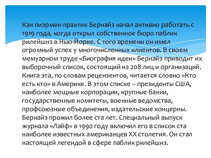 С того времени он имел огромный успех у многочисленных клиентов. В своем мемуарном труде «Биография идеи» Бернайз приводит их выборочный список, состоящий из 208 лиц и организаций. Книга эта, по словам рецензентов, читается словно «Кто есть кто» в Америке. В этом списке -- президенты США, наиболее мощные корпорации, крупные банки, государственные комитеты, военные ведомства, профсоюзные объединения, издательские концерны. Бернайз прожил более ста лет. Специальный выпуск журнала «Лайф» в 1990 году включил его в список ста наиболее известных американцев XX столетия. Он стал настоящей легендой в сфере паблик рилейшнз.