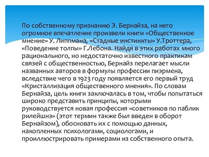 У.Троттера, «Поведение толпы» Г.Лебона. Найдя в этих работах много рационального, но недостаточно известного практикам связей с общественностью, Бернайз перелагает мысли названных авторов в формулы профессии пиэрмена, вследствие чего в 1923 году появляется его первый труд «Кристаллизация общественного мнения». По словам Бернайза, цель книги заключалась в том, чтобы попытаться широко представить принципы, которыми руководствуется новая профессия «советников по паблик рилейшнз» (этот термин также был введен в оборот Бернайзом), обосновать их с помощью данных, накопленных психологами, социологами, и проиллюстрировать примерами из собственного опыта.