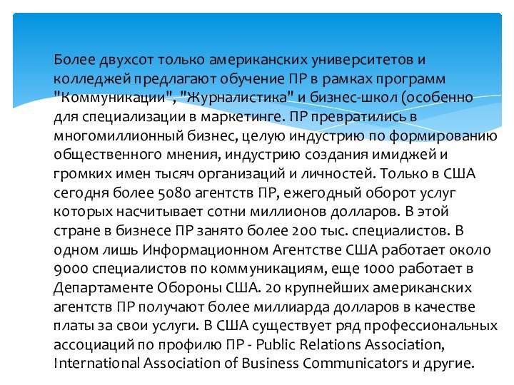 (особенно для специализации в маркетинге. ПР превратились в многомиллионный бизнес, целую индустрию по формированию общественного мнения, индустрию создания имиджей и громких имен тысяч организаций и личностей. Только в США сегодня более 5080 агентств ПР, ежегодный оборот услуг которых насчитывает сотни миллионов долларов. В этой стране в бизнесе ПР занято более 200 тыс. специалистов. В одном лишь Информационном Агентстве США работает около 9000 специалистов по коммуникациям, еще 1000 работает в Департаменте Обороны США. 20 крупнейших американских агентств ПР получают более миллиарда долларов в качестве платы за свои услуги. В США существует ряд профессиональных ассоциаций по профилю ПР - Public Relations Association, International Association of Business Communicators и другие.