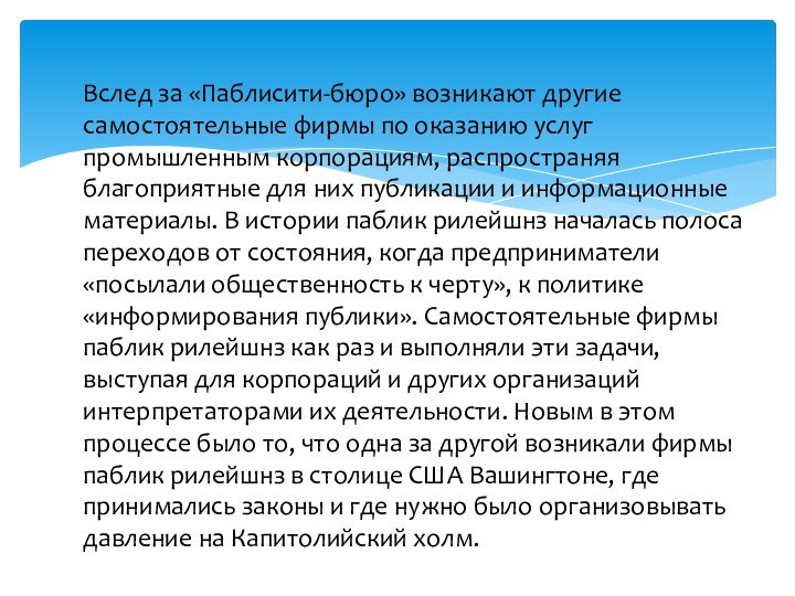 и информационные материалы. В истории паблик рилейшнз началась полоса переходов от состояния, когда предприниматели «посылали общественность к черту», к политике «информирования публики». Самостоятельные фирмы паблик рилейшнз как раз и выполняли эти задачи, выступая для корпораций и других организаций интерпретаторами их деятельности. Новым в этом процессе было то, что одна за другой возникали фирмы паблик рилейшнз в столице США Вашингтоне, где принимались законы и где нужно было организовывать давление на Капитолийский холм.