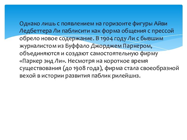 новое содержание. В 1904 году Ли с бывшим журналистом из Буффало Джорджем Паркером, объединяются и создают самостоятельную фирму «Паркер энд Ли». Несмотря на короткое время существования (до 1908 года), фирма стала своеобразной вехой в истории развития паблик рилейшнз.