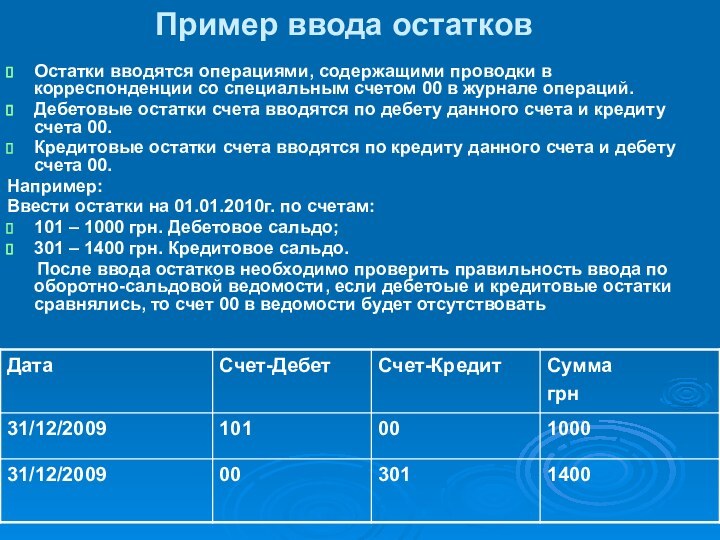 Кредитовые остатки счета вводятся по кредиту данного счета и дебету счета 00.