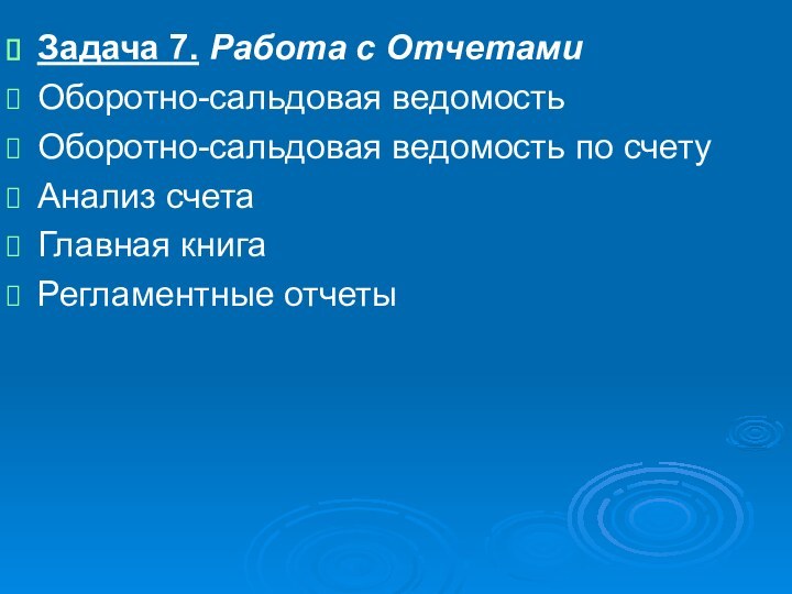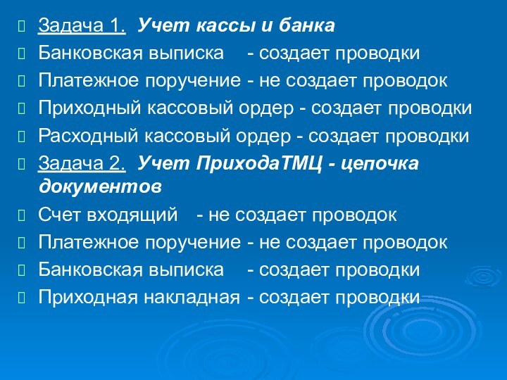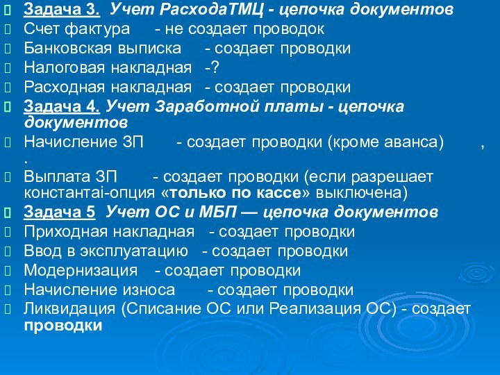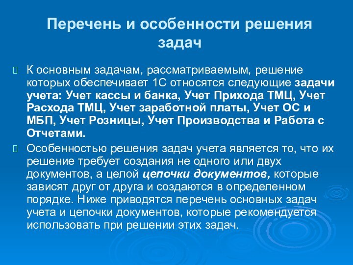 Особенностью решения задач учета является то, что их решение требует создания не одного или двух документов, а целой цепочки документов, которые зависят друг от друга и создаются в определенном порядке. Ниже приводятся перечень основных задач учета и цепочки документов, которые рекомендуется использовать при решении этих задач.