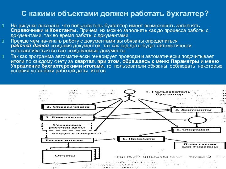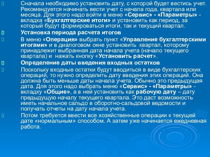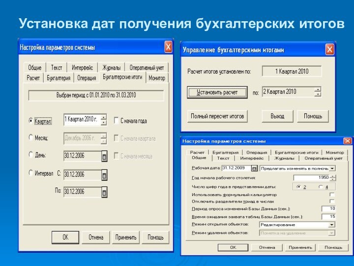 Так как программа автоматически генерирует проводки и автоматически подсчитывает итоги по каждому счету за квартал, при этом, обращаясь к меню Параметры и меню Управление бухгалтерскими итогами, то пользователи обязаны соблюдать некоторые условия установки рабочей даты итогов