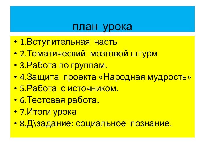 план урока1.Вступительная часть2.Тематический мозговой штурм3.Работа по группам.4.Защита проекта «Народная мудрость»5.Работа