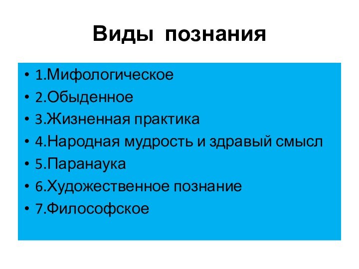 Виды познания1.Мифологическое2.Обыденное3.Жизненная практика4.Народная мудрость и здравый смысл5.Паранаука6.Художественное познание7.Философское